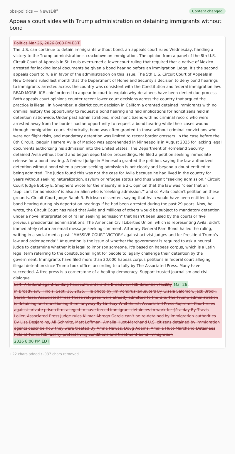 It's the second appeals court to rule in favor of the administration on this issue. The 5th U.S. Circuit Court of Appeals in New Orleans ruled last month that the Department of Homeland Security's decision to deny bond hearings to immigrants arrested across the country was consistent with the Constitution and federal immigration law.