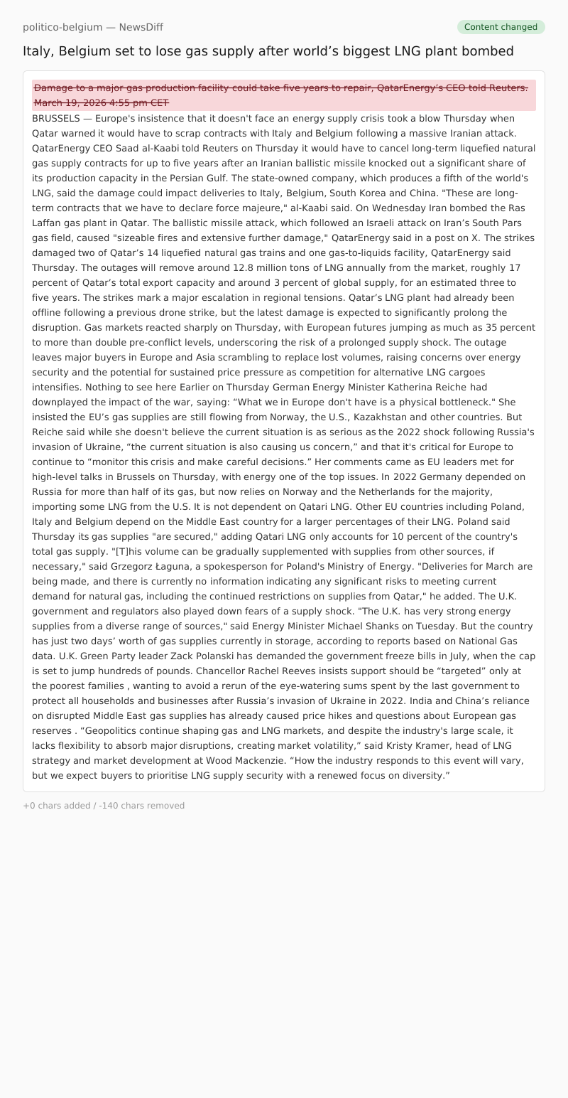 "Deliveries for March are being made, and there is currently no information indicating any significant risks to meeting current demand for natural gas, including the continued restrictions on supplies from Qatar," he added.