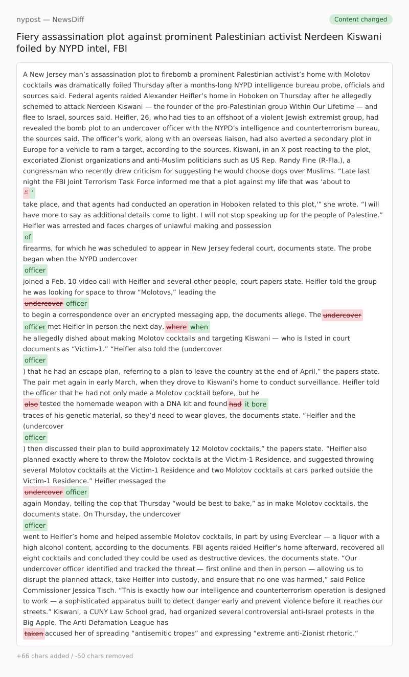 “Our undercover officer identified and tracked the threat — first online and then in person — allowing us to disrupt the planned attack, take Heifler into custody, and ensure that no one was harmed,” said Police Commissioner Jessica Tisch.