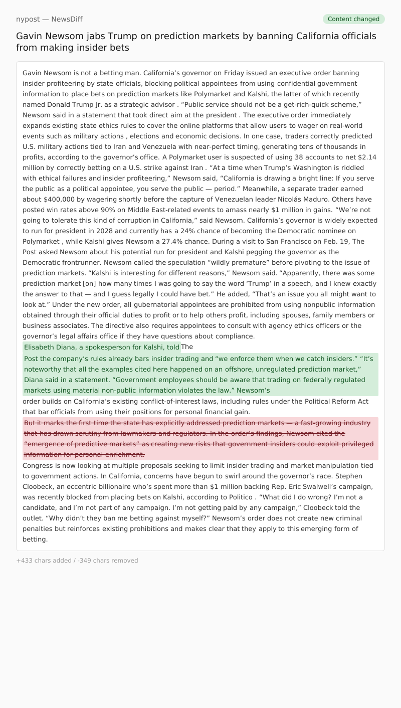 In the order’s findings, Newsom cited the “emergence of predictive markets” as creating new risks that government insiders could exploit privileged information for personal enrichment. Congress is now looking at multiple proposals seeking to limit insider trading and market manipulation tied to government actions.