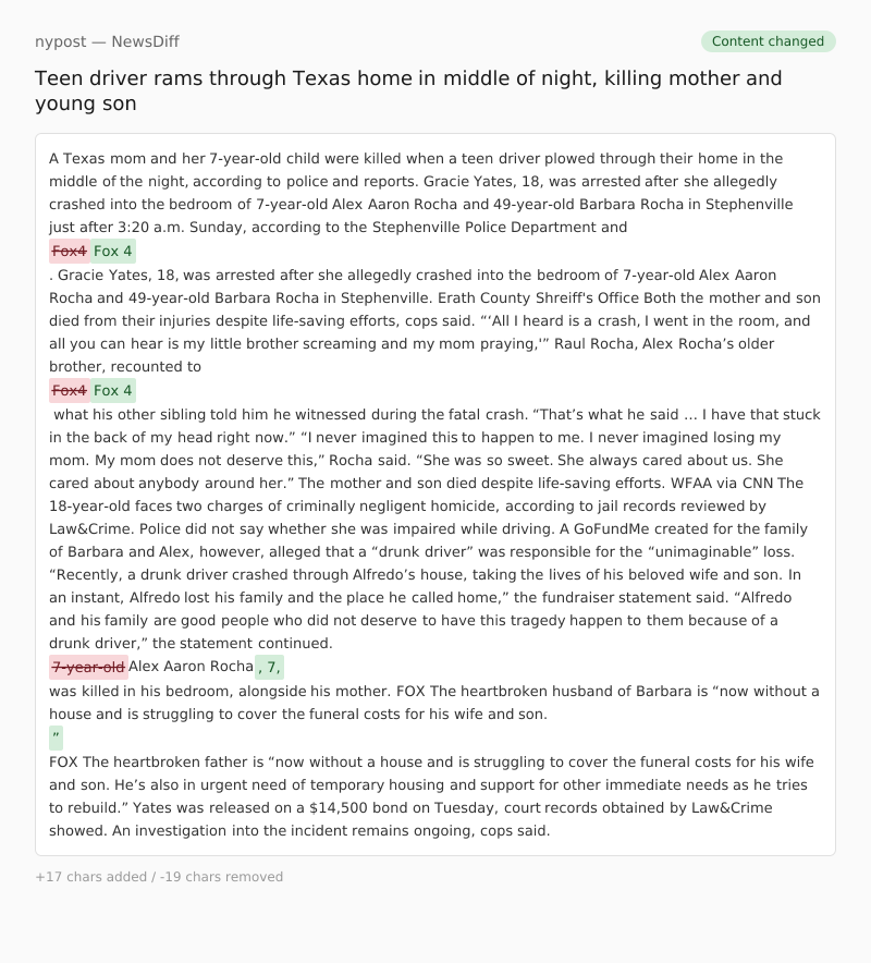 Gracie Yates, 18, was arrested after she allegedly crashed into the bedroom of 7-year-old Alex Aaron Rocha and 49-year-old Barbara Rocha in Stephenville just after 3:20 a.m. Sunday, according to the Stephenville Police Department and Fox4Fox 4.