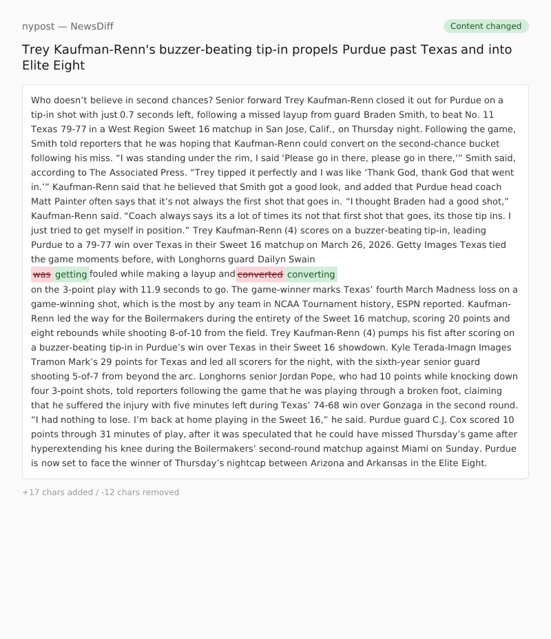 Senior forward Trey Kaufman-Renn closed it out for Purdue on a tip-in shot with just 0.7 seconds left, following a missed layup from guard Braden Smith, to beat No. 11 Texas 79-77 in a West Region Sweet 16 matchup in San Jose, Calif., on Thursday night.