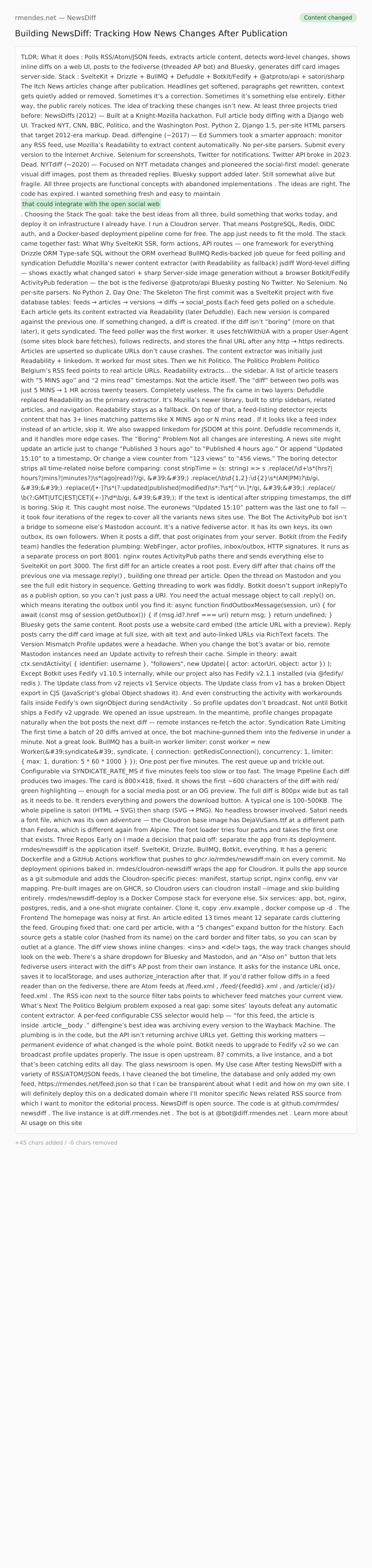 NewsDiff is open source. The code is at github.com/rmdes/newsdiff . The live instance is at diff.rmendes.net . The bot is at @bot@diff.rmendes.net .