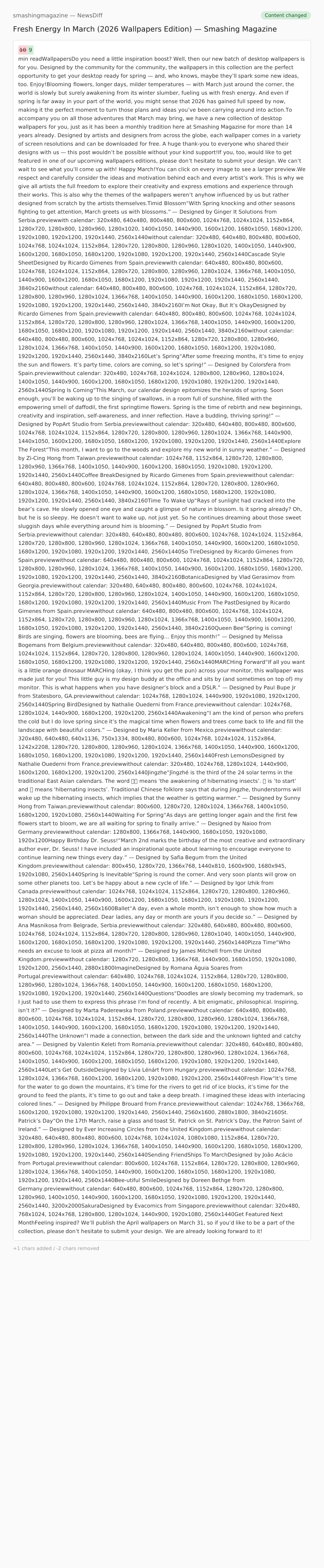 109 min readWallpapersDo you need a little inspiration boost? Well, then our new batch of desktop wallpapers is for you. Designed by the community for the community, the wallpapers in this collection are the perfect opportunity to get your desktop ready for spring — and, who knows, maybe they’ll spark some new ideas, too. Enjoy!Blooming flowers, longer days, milder temperatures — with March just around the corner, the world is slowly but surely awakening from its winter slumber, fueling us with fresh energy. And even if spring is far away in your part of the world, you might sense that 2026 has gained full speed by now, making it the perfect moment to turn those plans and ideas you’ve been carrying around into action.To accompany you on all those adventures that March may bring, we have a new collection of desktop wallpapers for you, just as it has been a monthly tradition here at Smashing Magazine for more than 14 years already. Designed by artists and designers from across the globe, each wallpaper comes in a variety of screen resolutions and can be downloaded for free. A huge thank-you to everyone who shared their designs with us — this post wouldn’t be possible without your kind support!If you, too, would like to get featured in one of our upcoming wallpapers editions, please don’t hesitate to submit your design. We can’t wait to see what you’ll come up with! Happy March!You can click on every image to see a larger preview.We respect and carefully consider the ideas and motivation behind each and every artist’s work. This is why we give all artists the full freedom to explore their creativity and express emotions and experience through their works. This is also why the themes of the wallpapers weren’t anyhow influenced by us but rather designed from scratch by the artists themselves.Timid Blossom“With Spring knocking and other seasons fighting to get attention, March greets us with blossoms.” — Designed by Ginger It Solutions from Serbia.previewwith calendar: 320x480, 640x480, 800x480, 800x600, 1024x768, 1024x1024, 1152x864, 1280x720, 1280x800, 1280x960, 1280x1020, 1400x1050, 1440x900, 1600x1200, 1680x1050, 1680x1200, 1920x1080, 1920x1200, 1920x1440, 2560x1440without calendar: 320x480, 640x480, 800x480, 800x600, 1024x768, 1024x1024, 1152x864, 1280x720, 1280x800, 1280x960, 1280x1020, 1400x1050, 1440x900, 1600x1200, 1680x1050, 1680x1200, 1920x1080, 1920x1200, 1920x1440, 2560x1440Cascade Style SheetDesigned by Ricardo Gimenes from Spain.previewwith calendar: 640x480, 800x480, 800x600, 1024x768, 1024x1024, 1152x864, 1280x720, 1280x800, 1280x960, 1280x1024, 1366x768, 1400x1050, 1440x900, 1600x1200, 1680x1050, 1680x1200, 1920x1080, 1920x1200, 1920x1440, 2560x1440, 3840x2160without calendar: 640x480, 800x480, 800x600, 1024x768, 1024x1024, 1152x864, 1280x720, 1280x800, 1280x960, 1280x1024, 1366x768, 1400x1050, 1440x900, 1600x1200, 1680x1050, 1680x1200, 1920x1080, 1920x1200, 1920x1440, 2560x1440, 3840x2160I’m Not Okay, But It’s OkayDesigned by Ricardo Gimenes from Spain.previewwith calendar: 640x480, 800x480, 800x600, 1024x768, 1024x1024, 1152x864, 1280x720, 1280x800, 1280x960, 1280x1024, 1366x768, 1400x1050, 1440x900, 1600x1200, 1680x1050, 1680x1200, 1920x1080, 1920x1200, 1920x1440, 2560x1440, 3840x2160without calendar: 640x480, 800x480, 800x600, 1024x768, 1024x1024, 1152x864, 1280x720, 1280x800, 1280x960, 1280x1024, 1366x768, 1400x1050, 1440x900, 1600x1200, 1680x1050, 1680x1200, 1920x1080, 1920x1200, 1920x1440, 2560x1440, 3840x2160Let’s Spring“After some freezing months, it’s time to enjoy the sun and flowers. It’s party time, colors are coming, so let’s spring!” — Designed by Colorsfera from Spain.previewwithout calendar: 320x480, 1024x768, 1024x1024, 1280x800, 1280x960, 1280x1024, 1400x1050, 1440x900, 1600x1200, 1680x1050, 1680x1200, 1920x1080, 1920x1200, 1920x1440, 2560x1440Spring Is Coming“This March, our calendar design epitomizes the heralds of spring. Soon enough, you’ll be waking up to the singing of swallows, in a room full of sunshine, filled with the empowering smell of daffodil, the first springtime flowers. Spring is the time of rebirth and new beginnings, creativity and inspiration, self-awareness, and inner reflection. Have a budding, thriving spring!” — Designed by PopArt Studio from Serbia.previewwithout calendar: 320x480, 640x480, 800x480, 800x600, 1024x768, 1024x1024, 1152x864, 1280x720, 1280x800, 1280x960, 1280x1024, 1366x768, 1440x900, 1440x1050, 1600x1200, 1680x1050, 1680x1200, 1920x1080, 1920x1200, 1920x1440, 2560x1440Explore The Forest“This month, I want to go to the woods and explore my new world in sunny weather.” — Designed by Zi-Cing Hong from Taiwan.previewwithout calendar: 1024x768, 1152x864, 1280x720, 1280x800, 1280x960, 1366x768, 1400x1050, 1440x900, 1600x1200, 1680x1050, 1920x1080, 1920x1200, 1920x1440, 2560x1440Coffee BreakDesigned by Ricardo Gimenes from Spain.previewwithout calendar: 640x480, 800x480, 800x600, 1024x768, 1024x1024, 1152x864, 1280x720, 1280x800, 1280x960, 1280x1024, 1366x768, 1400x1050, 1440x900, 1600x1200, 1680x1050, 1680x1200, 1920x1080, 1920x1200, 1920x1440, 2560x1440, 3840x2160Time To Wake Up“Rays of sunlight had cracked into the bear’s cave. He slowly opened one eye and caught a glimpse of nature in blossom. Is it spring already? Oh, but he is so sleepy. He doesn’t want to wake up, not just yet. So he continues dreaming about those sweet sluggish days while everything around him is blooming.” — Designed by PopArt Studio from Serbia.previewwithout calendar: 320x480, 640x480, 800x480, 800x600, 1024x768, 1024x1024, 1152x864, 1280x720, 1280x800, 1280x960, 1280x1024, 1366x768, 1400x1050, 1440x900, 1600x1200, 1680x1050, 1680x1200, 1920x1080, 1920x1200, 1920x1440, 2560x1440So TireDesigned by Ricardo Gimenes from Spain.previewwithout calendar: 640x480, 800x480, 800x600, 1024x768, 1024x1024, 1152x864, 1280x720, 1280x800, 1280x960, 1280x1024, 1366x768, 1400x1050, 1440x900, 160