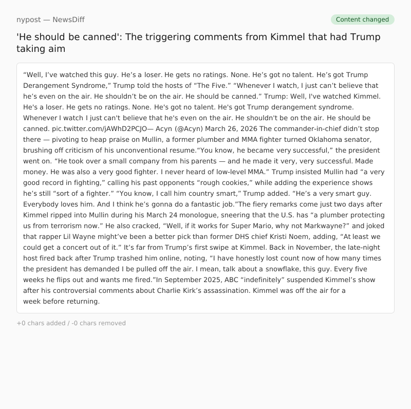 Trump: Well, I've watched Kimmel. He's a loser. He gets no ratings. None. He's got no talent. He's got Trump derangement syndrome. Whenever I watch I just can't believe that he's even on the air. He shouldn't be on the air. He should be canned. pic.twitter.com/jAWhD2PCJO— Acyn (@Acyn) March 26, 2026