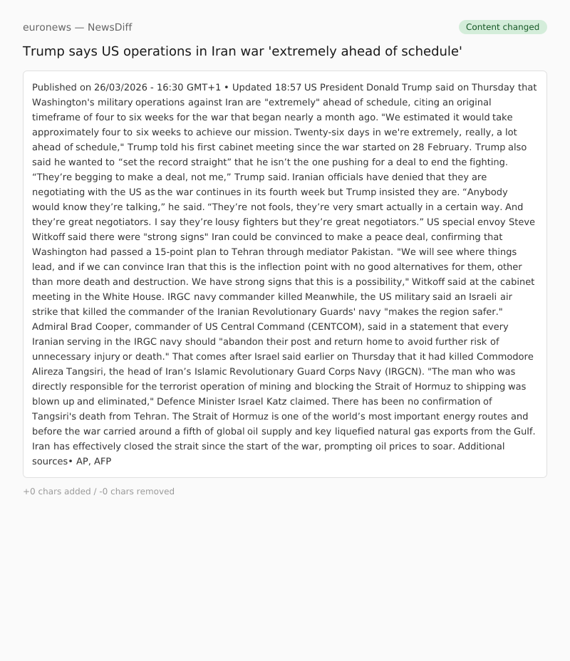 "We estimated it would take approximately four to six weeks to achieve our mission. Twenty-six days in we're extremely, really, a lot ahead of schedule," Trump told his first cabinet meeting since the war started on 28 February.