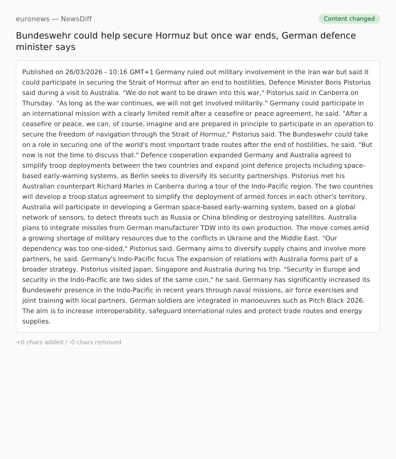 Germany ruled out military involvement in the Iran war but said it could participate in securing the Strait of Hormuz after an end to hostilities, Defence Minister Boris Pistorius said during a visit to Australia.