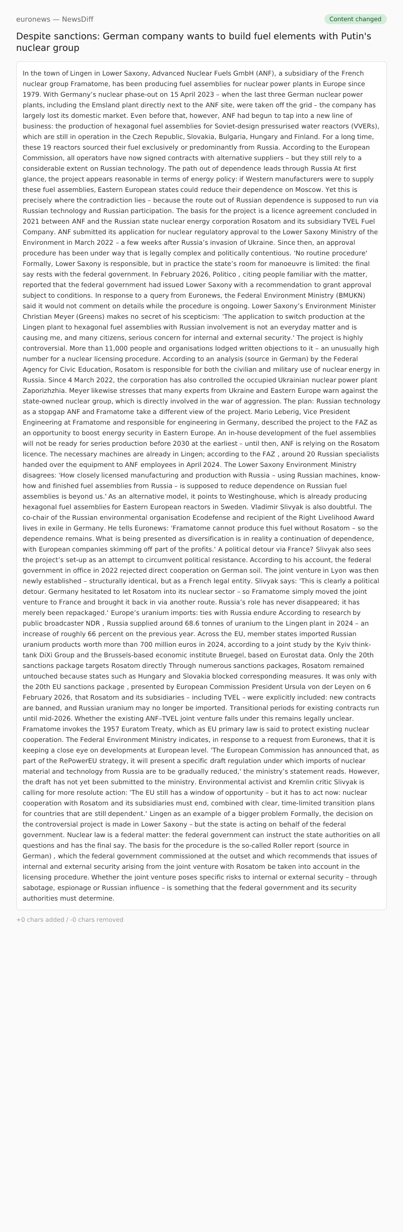 Through numerous sanctions packages, Rosatom remained untouched because states such as Hungary and Slovakia blocked corresponding measures. It was only with the 20th EU sanctions package , presented by European Commission President Ursula von der Leyen on 6 February 2026, that Rosatom and its subsidiaries – including TVEL – were explicitly included: new contracts are banned, and Russian uranium may no longer be imported. Transitional periods for existing contracts run until mid-2026.