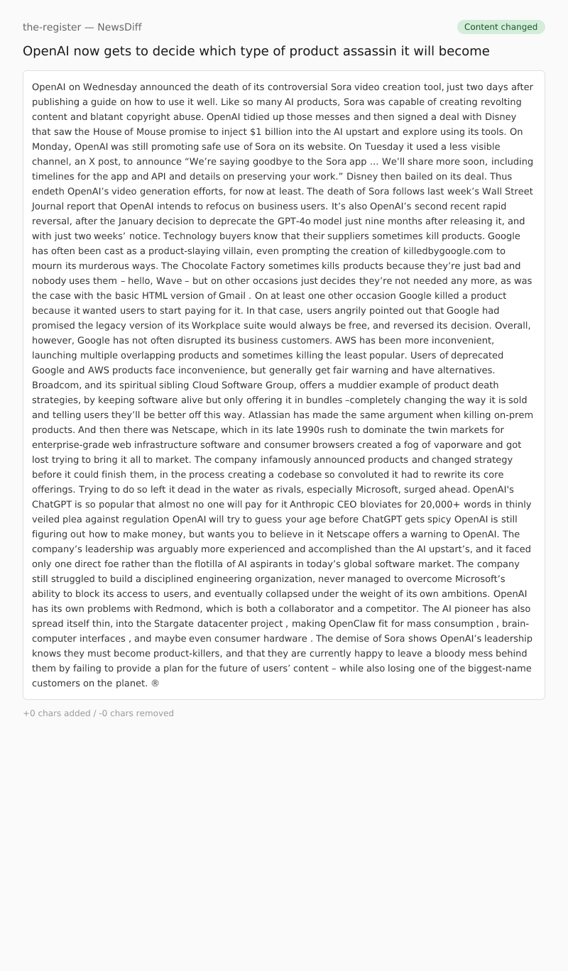 The demise of Sora shows OpenAI’s leadership knows they must become product-killers, and that they are currently happy to leave a bloody mess behind them by failing to provide a plan for the future of users’ content – while also losing one of the biggest-name customers on the planet. ®