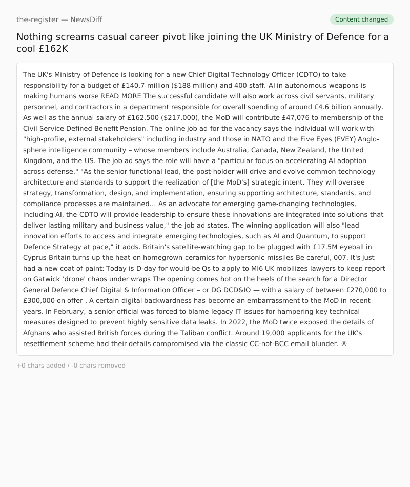 "As the senior functional lead, the post-holder will drive and evolve common technology architecture and standards to support the realization of [the MoD's] strategic intent. They will oversee strategy, transformation, design, and implementation, ensuring supporting architecture, standards, and compliance processes are maintained… As an advocate for emerging game-changing technologies, including AI, the CDTO will provide leadership to ensure these innovations are integrated into solutions that deliver lasting military and business value," the job ad states.