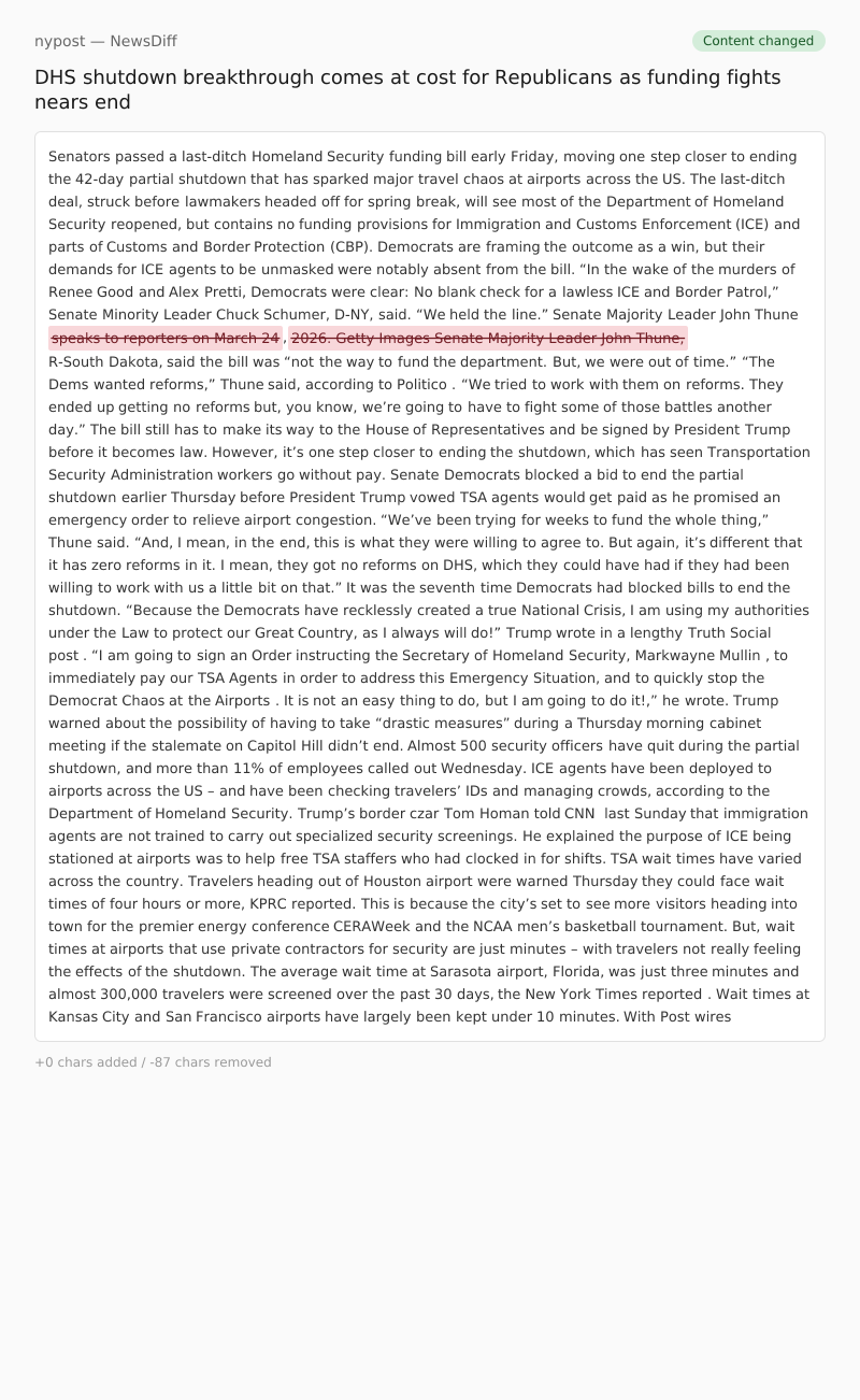 “We’ve been trying for weeks to fund the whole thing,” Thune said. “And, I mean, in the end, this is what they were willing to agree to. But again, it’s different that it has zero reforms in it. I mean, they got no reforms on DHS, which they could have had if they had been willing to work with us a little bit on that.”