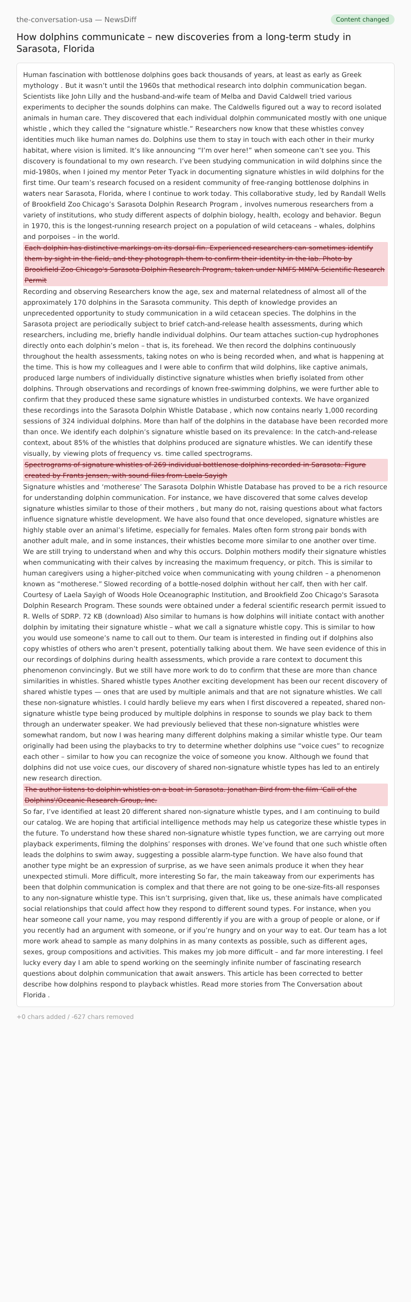 This is how my colleagues and I were able to confirm that wild dolphins, like captive animals, produced large numbers of individually distinctive signature whistles when briefly isolated from other dolphins. Through observations and recordings of known free-swimming dolphins, we were further able to confirm that they produced these same signature whistles in undisturbed contexts.