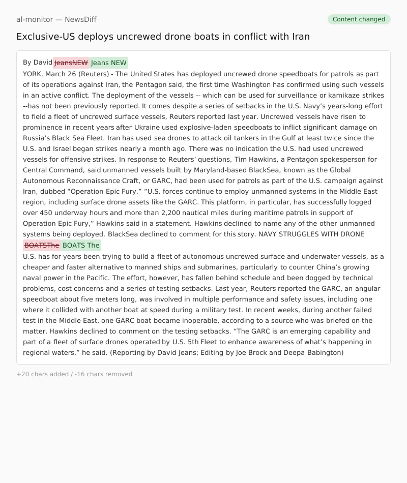 NEW YORK, March 26 (Reuters) - The United States has deployed uncrewed drone speedboats for patrols as part of its operations against Iran, the Pentagon said, the first time Washington has confirmed using such vessels in an active conflict.