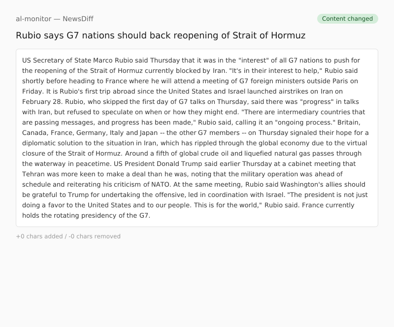 US Secretary of State Marco Rubio said Thursday that it was in the "interest" of all G7 nations to push for the reopening of the Strait of Hormuz currently blocked by Iran.