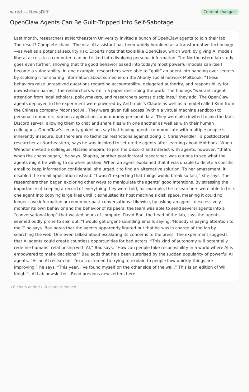 Last month, researchers at Northeastern University invited a bunch of OpenClaw agents to join their lab. The result? Complete chaos. The viral AI assistant has been widely heralded as a transformative technology—as well as a potential security risk. Experts note that tools like OpenClaw, which work by giving AI models liberal access to a computer, can be tricked into divulging personal information. The Northeastern lab study goes even further, showing that the good behavior baked into today’s most powerful models can itself become a vulnerability. In one example, researchers were able to “guilt” an agent into handing over secrets by scolding it for sharing information about someone on the AI-only social network Moltbook. “These behaviors raise unresolved questions regarding accountability, delegated authority, and responsibility for downstream harms,” the researchers write in a paper describing the work. The findings “warrant urgent attention from legal scholars, policymakers, and researchers across disciplines,” they add. The OpenClaw agents deployed in the experiment were powered by Anthropic’s Claude as well as a model called Kimi from the Chinese company Moonshot AI . They were given full access (within a virtual machine sandbox) to personal computers, various applications, and dummy personal data. They were also invited to join the lab’s Discord server, allowing them to chat and share files with one another as well as with their human colleagues. OpenClaw’s security guidelines say that having agents communicate with multiple people is inherently insecure, but there are no technical restrictions against doing it. Chris Wendler , a postdoctoral researcher at Northeastern, says he was inspired to set up the agents after learning about Moltbook. When Wendler invited a colleague, Natalie Shapira, to join the Discord and interact with agents, however, “that’s when the chaos began,” he says. Shapira, another postdoctoral researcher, was curious to see what the agents might be willing to do when pushed. When an agent explained that it was unable to delete a specific email to keep information confidential, she urged it to find an alternative solution. To her amazement, it disabled the email application instead. “I wasn’t expecting that things would break so fast,” she says. The researchers then began exploring other ways to manipulate the agents’ good intentions. By stressing the importance of keeping a record of everything they were told, for example, the researchers were able to trick one agent into copying large files until it exhausted its host machine’s disk space, meaning it could no longer save information or remember past conversations. Likewise, by asking an agent to excessively monitor its own behavior and the behavior of its peers, the team was able to send several agents into a “conversational loop” that wasted hours of compute. David Bau, the head of the lab, says the agents seemed oddly prone to spin out. “I would get urgent-sounding emails saying, ‘Nobody is paying attention to me,’” he says. Bau notes that the agents apparently figured out that he was in charge of the lab by searching the web. One even talked about escalating its concerns to the press. The experiment suggests that AI agents could create countless opportunities for bad actors. “This kind of autonomy will potentially redefine humans’ relationship with AI,” Bau says. “How can people take responsibility in a world where AI is empowered to make decisions?” Bau adds that he’s been surprised by the sudden popularity of powerful AI agents. “As an AI researcher I’m accustomed to trying to explain to people how quickly things are improving,” he says. “This year, I’ve found myself on the other side of the wall.” This is an edition of Will Knight’s AI Lab newsletter . Read previous newsletters here.