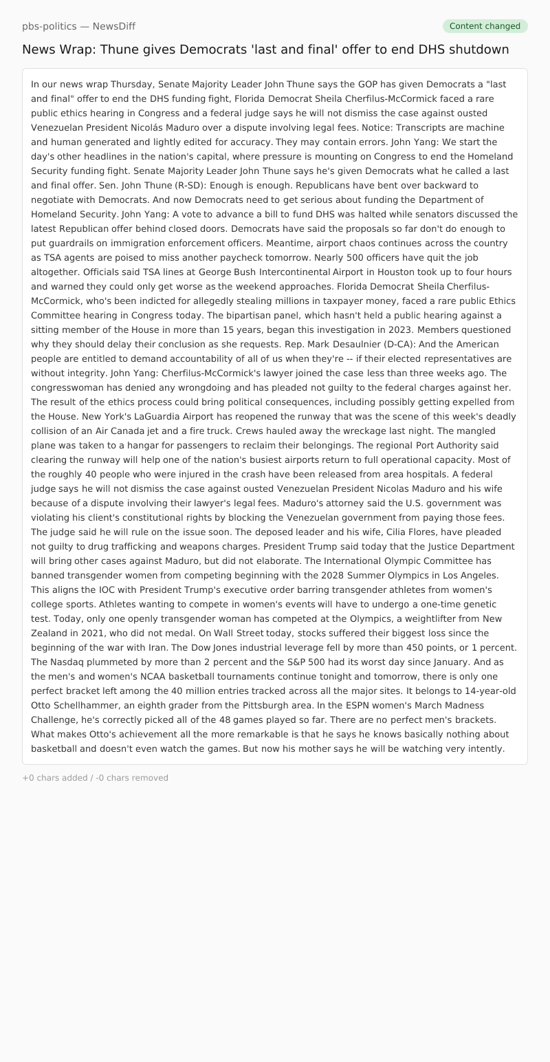In our news wrap Thursday, Senate Majority Leader John Thune says the GOP has given Democrats a "last and final" offer to end the DHS funding fight, Florida Democrat Sheila Cherfilus-McCormick faced a rare public ethics hearing in Congress and a federal judge says he will not dismiss the case against ousted Venezuelan President Nicolás Maduro over a dispute involving legal fees.