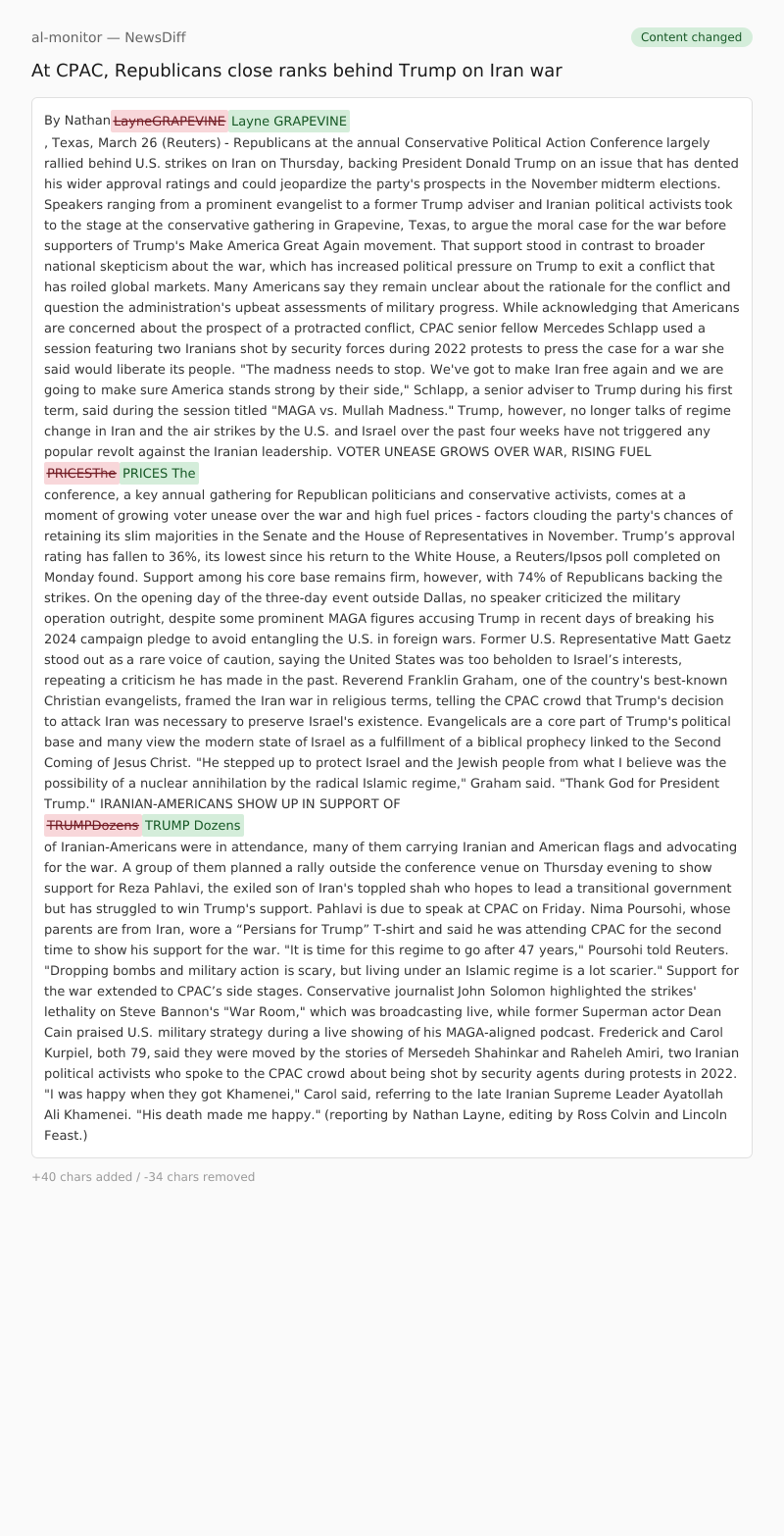 GRAPEVINE, Texas, March 26 (Reuters) - Republicans at the annual Conservative Political Action Conference largely rallied behind U.S. strikes on Iran on Thursday, backing President Donald Trump on an issue that has dented his wider approval ratings and could jeopardize the party's prospects in the November midterm elections.