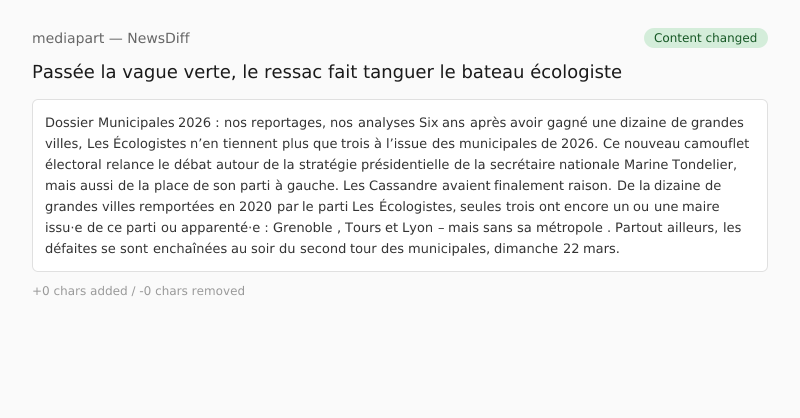 Les Cassandre avaient finalement raison. De la dizaine de grandes villes remportées en 2020 par le parti Les Écologistes, seules trois ont encore un ou une maire issu·e de ce parti ou apparenté·e : Grenoble , Tours et Lyon – mais sans sa métropole . Partout ailleurs, les défaites se sont enchaînées au soir du second tour des municipales, dimanche 22 mars.