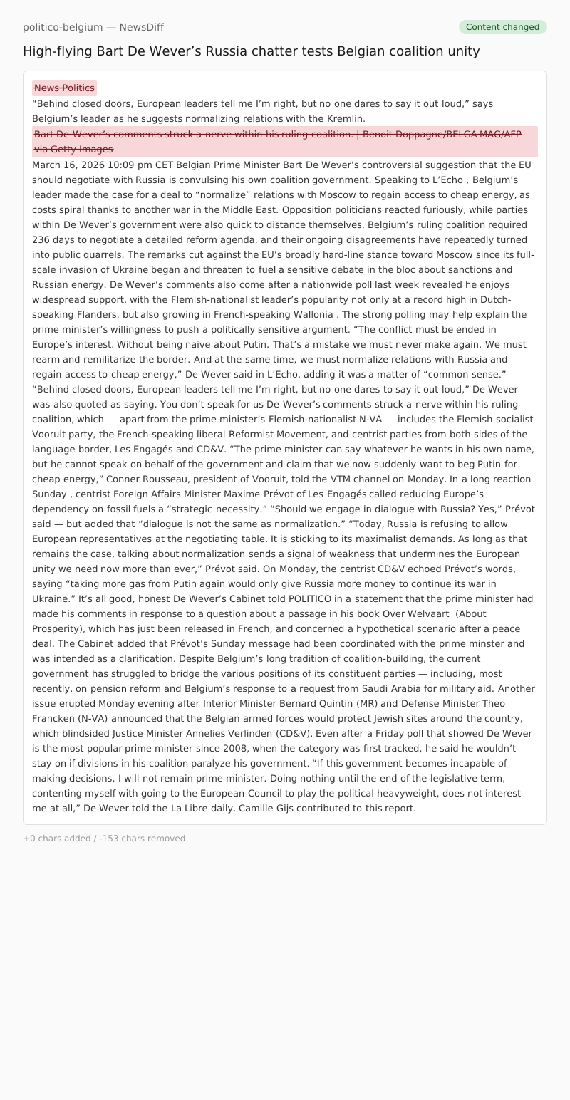De Wever’s comments also come after a nationwide poll last week revealed he enjoys widespread support, with the Flemish-nationalist leader’s popularity not only at a record high in Dutch-speaking Flanders, but also growing in French-speaking Wallonia . The strong polling may help explain the prime minister’s willingness to push a politically sensitive argument.
