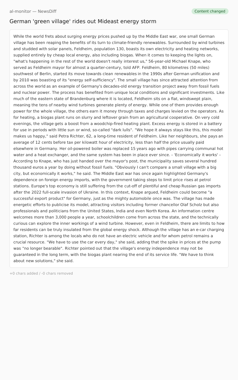 "We hope it always stays like this, this model makes us happy," said Petra Richter, 62, a long-time resident of Feldheim.
