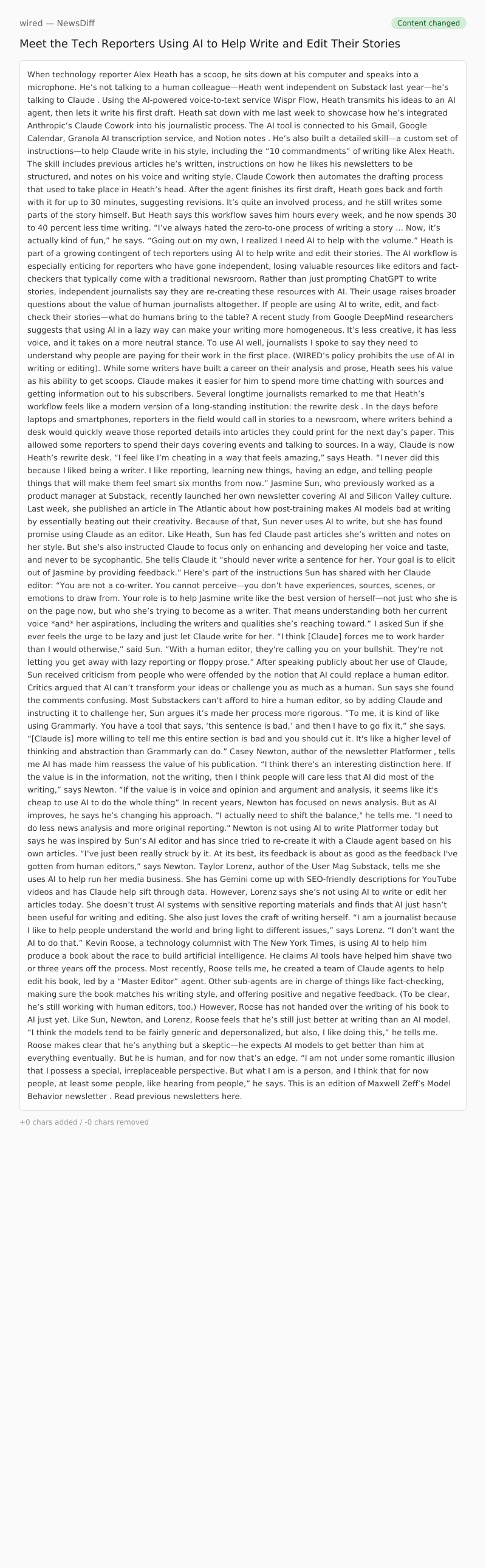 Newton is not using AI to write Platformer today but says he was inspired by Sun’s AI editor and has since tried to re-create it with a Claude agent based on his own articles. “I’ve just been really struck by it. At its best, its feedback is about as good as the feedback I've gotten from human editors,” says Newton.
