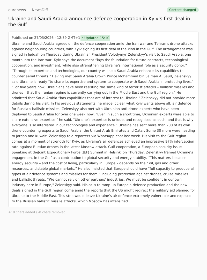 The arrangement was signed in Jeddah on Thursday during Ukrainian President Volodymyr Zelenskyy’s visit to Saudi Arabia, one month into the Iran war.