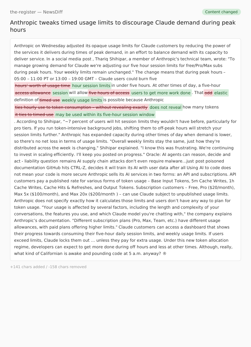 The change means that during peak hours – 05:00 – 11:00 PT or 13:00 – 19:00 GMT – Claude users could burn five hours’ worth of usage timehour session limits in under five hours. At other times of day, a five-hour access allowancesession will allow five hours of accessusers to get more work done. That oddelastic definition of timed useweekly usage limits is possible because Anthropic ties hourly use to token consumption – without revealing exactlydoes not reveal how many tokens it ties to timed usemay be used within its five-hour session window.