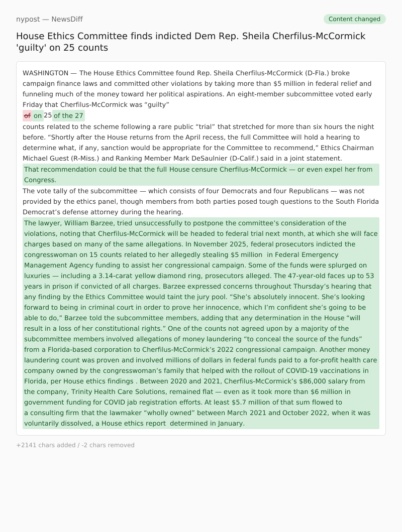 An eight-member subcommittee voted early Friday that Cherfilus-McCormick was “guilty” ofon 25 of the 27 counts related to the scheme following a rare public “trial” that stretched for more than six hours the night before.