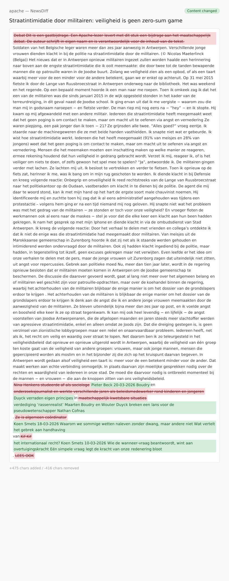 Ik denk aan de angst die ik en andere jonge vrouwen meemaakten door de aanwezigheid van de militairen. Ze bleven uiteindelijk bijna meer dan zes jaar op post, en ik voelde angst en boosheid elke keer ik ze op straat tegenkwam. Ik kan mij ook heel levendig − en lijfelijk − de angst voorstellen van Joodse Antwerpenaren, die de afgelopen maanden en jaren steeds meer slachtoffer werden van agressieve straatintimidatie, enkel en alleen omdat ze Joods zijn. Dat die dreiging gestegen is, is geen verzinsel van zionistische lobbygroepen maar een reëel en onaanvaardbaar probleem. Iedereen heeft, net als ik, het recht om veilig en waardig over straat te lopen.