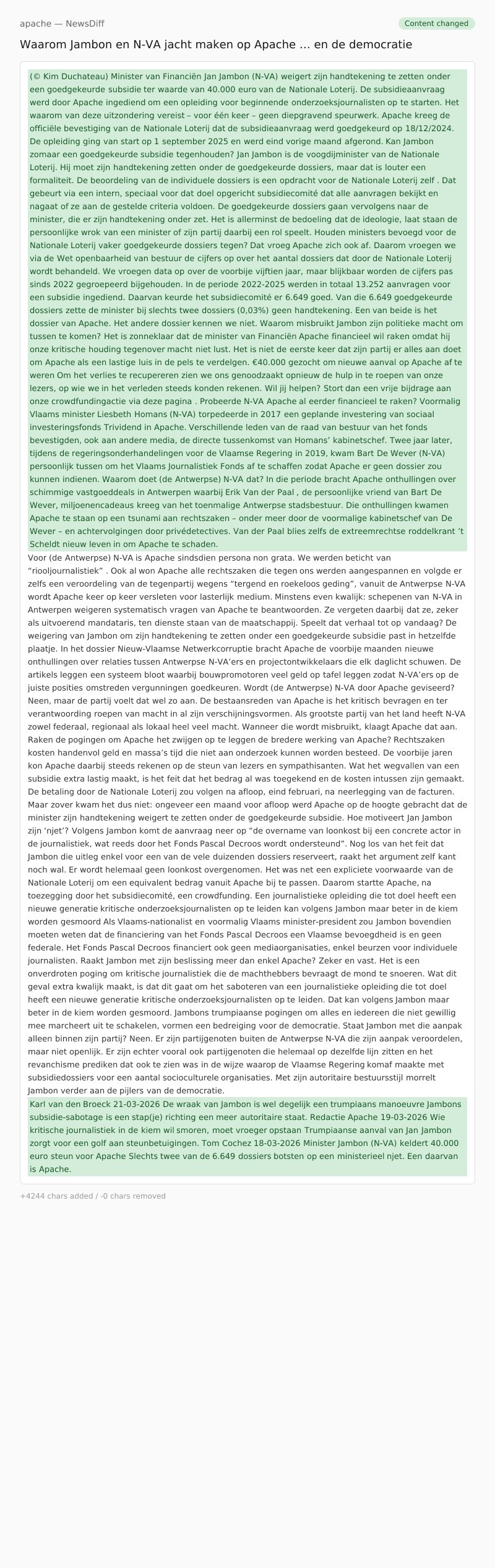 Twee jaar later, tijdens de regeringsonderhandelingen voor de Vlaamse Regering in 2019, kwam Bart De Wever (N-VA) persoonlijk tussen om het Vlaams Journalistiek Fonds af te schaffen zodat Apache er geen dossier zou kunnen indienen.