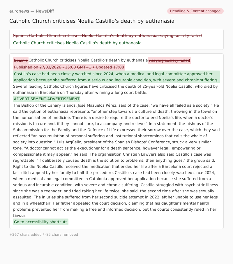 Spain's Catholic Church criticises Noelia Castillo's death by euthanasia, saying society failed