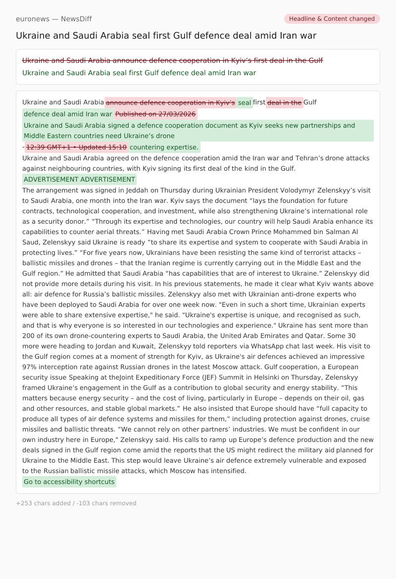 Published on 27/03/2026 Ukraine and Saudi Arabia signed a defence cooperation document as Kyiv seeks new partnerships and Middle Eastern countries need Ukraine’s drone- 12:39 GMT+1 • Updated
