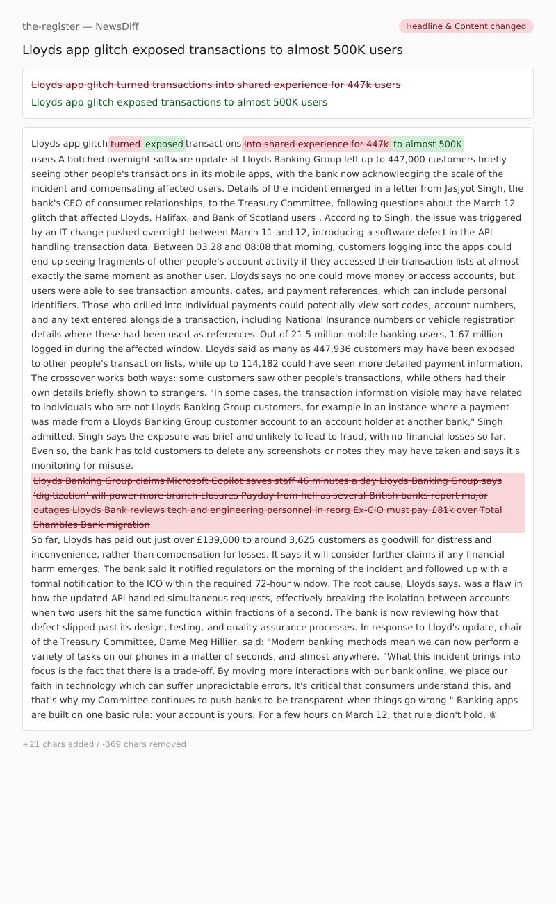 A botched overnight software update at Lloyds Banking Group left up to 447,000 customers briefly seeing other people's transactions in its mobile apps, with the bank now acknowledging the scale of the incident and compensating affected users.