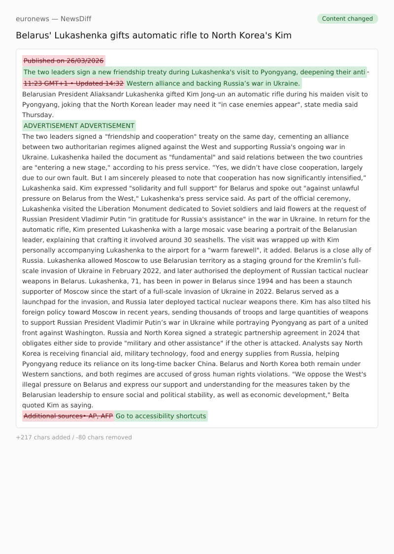 Published on 26/03/2026 The two leaders sign a new friendship treaty during Lukashenka's visit to Pyongyang, deepening their anti- 11:23 GMT+1 • Updated