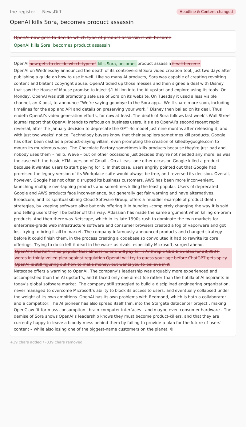 The demise of Sora shows OpenAI’s leadership knows they must become product-killers, and that they are currently happy to leave a bloody mess behind them by failing to provide a plan for the future of users’ content – while also losing one of the biggest-name customers on the planet. ®