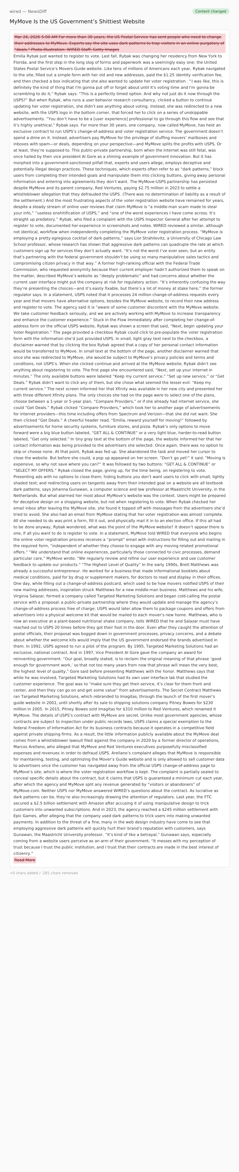 “MyMove is employing a pretty egregious cocktail of dark patterns,” says Lior Strahilevitz, a University of Chicago Law School professor, whose research has shown that aggressive dark patterns can quadruple the rate at which customers sign up for services they don’t actually want. “It’s not the worst I’ve ever seen, but an entity that’s partnering with the federal government shouldn’t be using so many manipulative sales tactics and compromising citizen privacy in that way.”