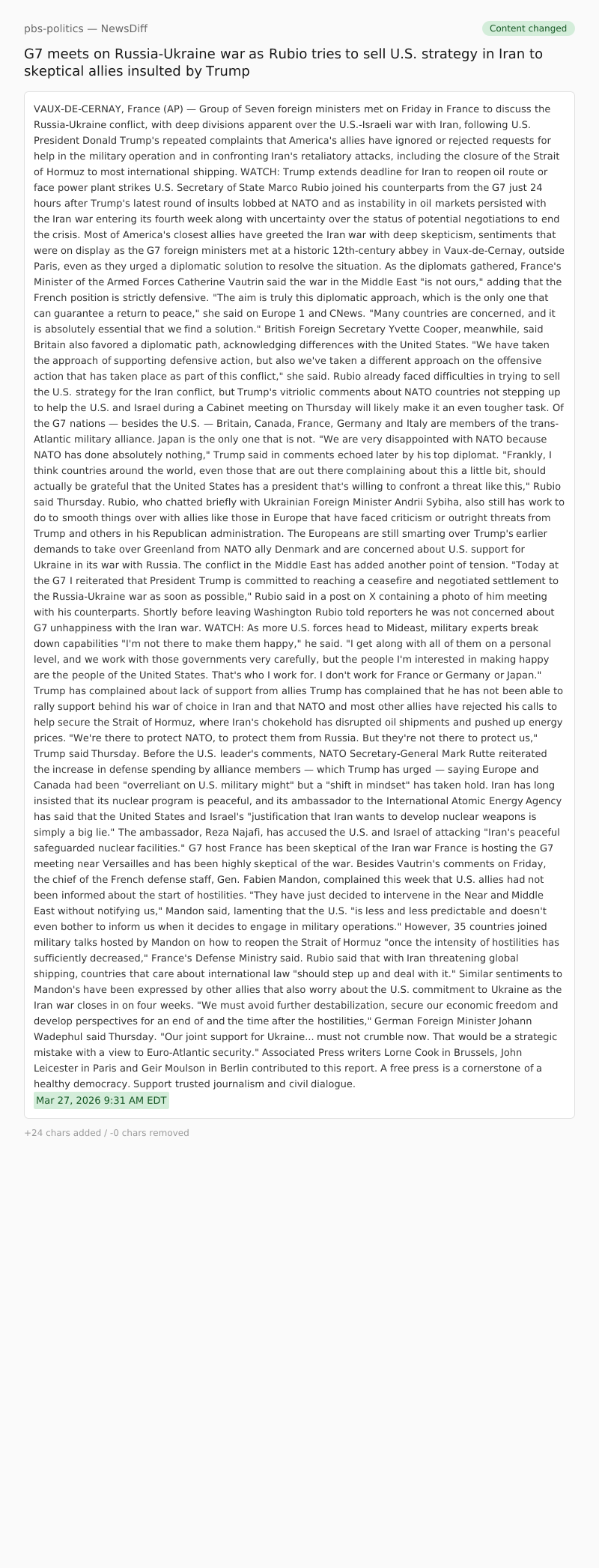 Most of America's closest allies have greeted the Iran war with deep skepticism, sentiments that were on display as the G7 foreign ministers met at a historic 12th-century abbey in Vaux-de-Cernay, outside Paris, even as they urged a diplomatic solution to resolve the situation.