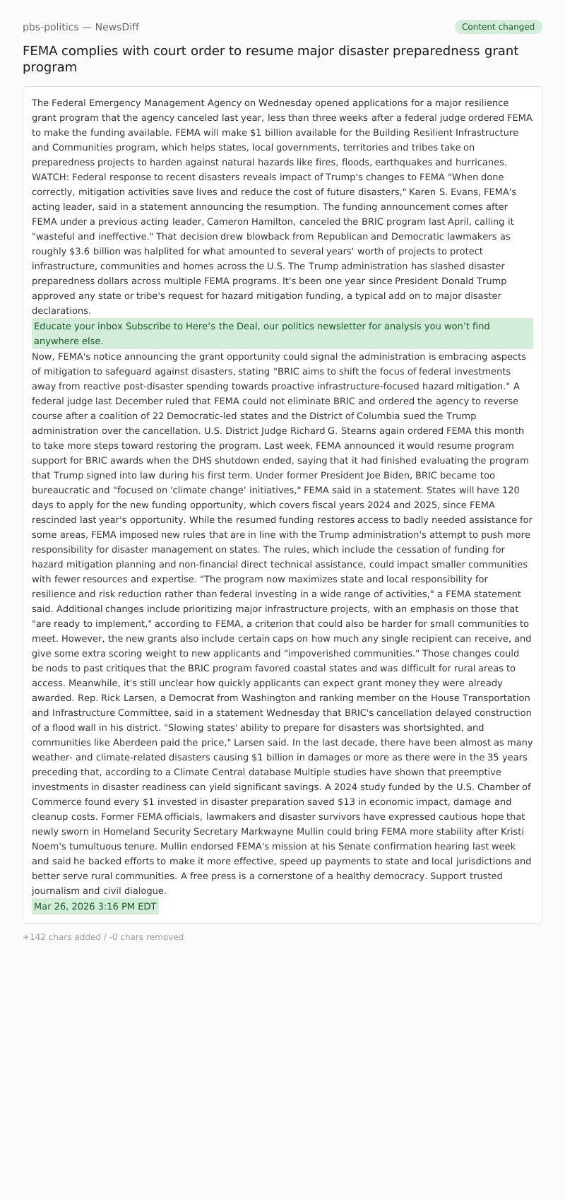A federal judge last December ruled that FEMA could not eliminate BRIC and ordered the agency to reverse course after a coalition of 22 Democratic-led states and the District of Columbia sued the Trump administration over the cancellation. U.S. District Judge Richard G. Stearns again ordered FEMA this month to take more steps toward restoring the program.