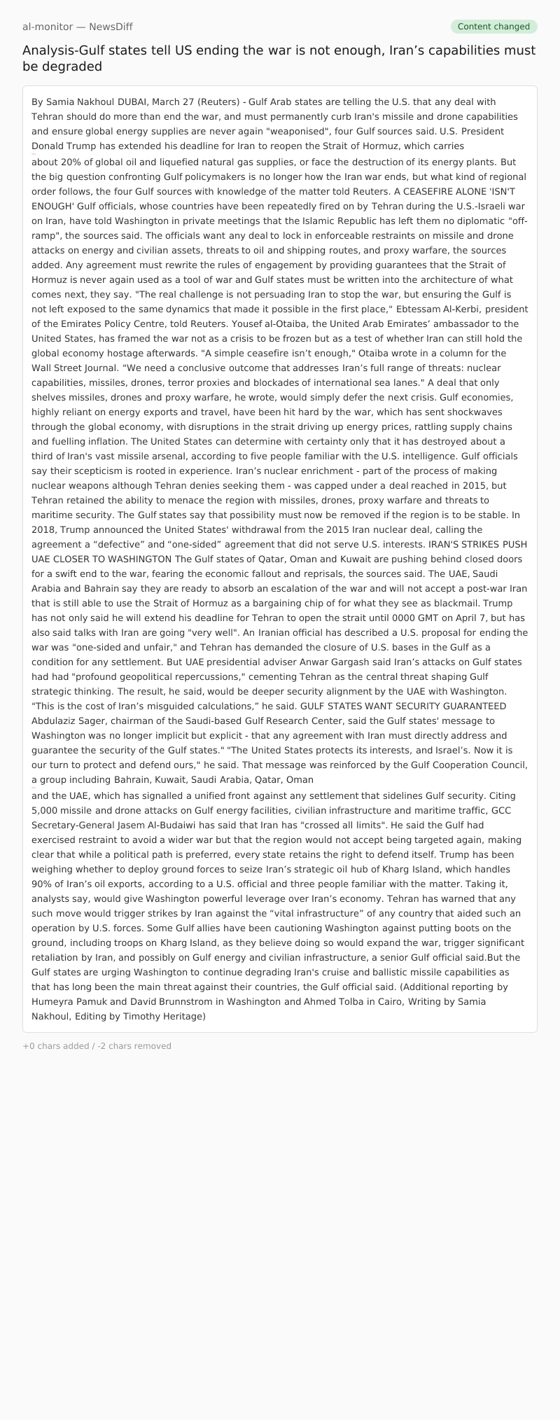 DUBAI, March 27 (Reuters) - Gulf Arab states are telling the U.S. that any deal with Tehran should do more than end the war, and must permanently curb Iran's missile and drone capabilities and ensure global energy supplies are never again "weaponised", four Gulf sources said.