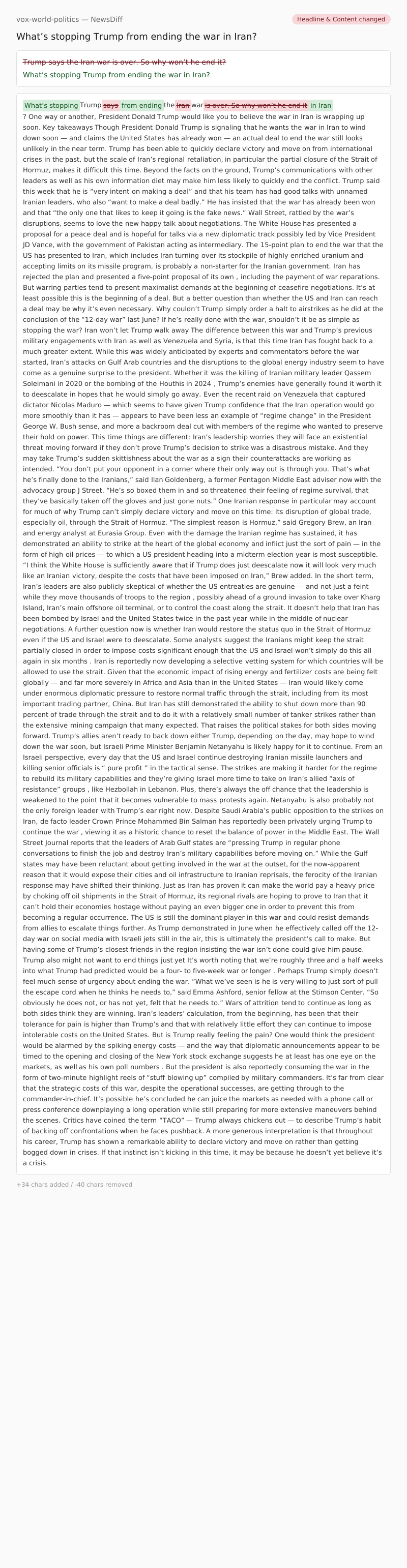 “The simplest reason is Hormuz,” said Gregory Brew, an Iran and energy analyst at Eurasia Group. Even with the damage the Iranian regime has sustained, it has demonstrated an ability to strike at the heart of the global economy and inflict just the sort of pain — in the form of high oil prices — to which a US president heading into a midterm election year is most susceptible. “I think the White House is sufficiently aware that if Trump does just deescalate now it will look very much like an Iranian victory, despite the costs that have been imposed on Iran,” Brew added.