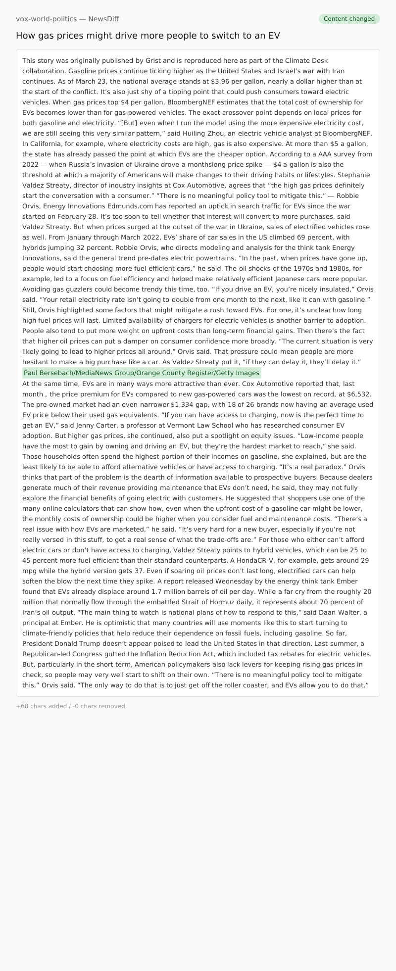 So far, President Donald Trump doesn’t appear poised to lead the United States in that direction. Last summer, a Republican-led Congress gutted the Inflation Reduction Act, which included tax rebates for electric vehicles. But, particularly in the short term, American policymakers also lack levers for keeping rising gas prices in check, so people may very well start to shift on their own.