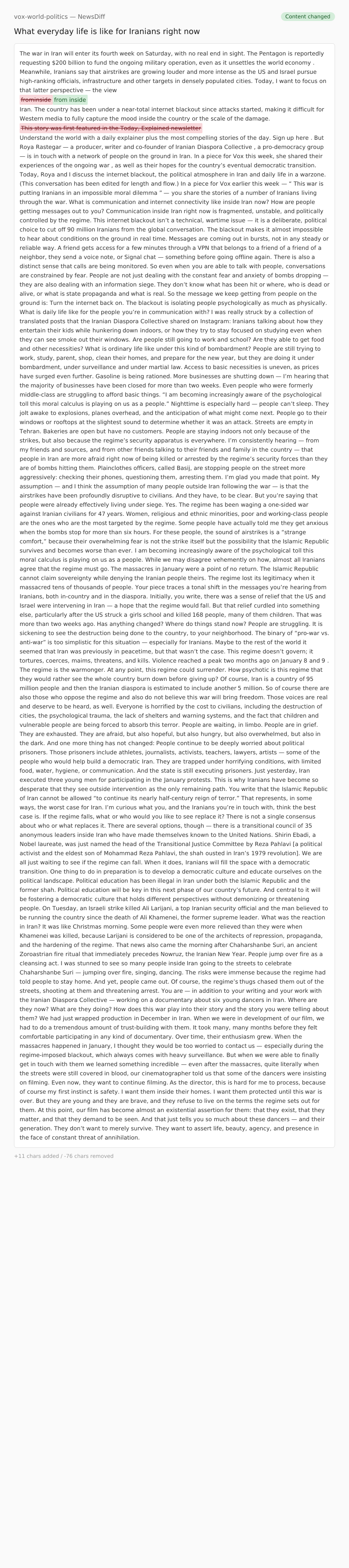 Your piece traces a tonal shift in the messages you’re hearing from Iranians, both in-country and in the diaspora. Initially, you write, there was a sense of relief that the US and Israel were intervening in Iran — a hope that the regime would fall. But that relief curdled into something else, particularly after the US struck a girls school and killed 168 people, many of them children. That was more than two weeks ago. Has anything changed? Where do things stand now?