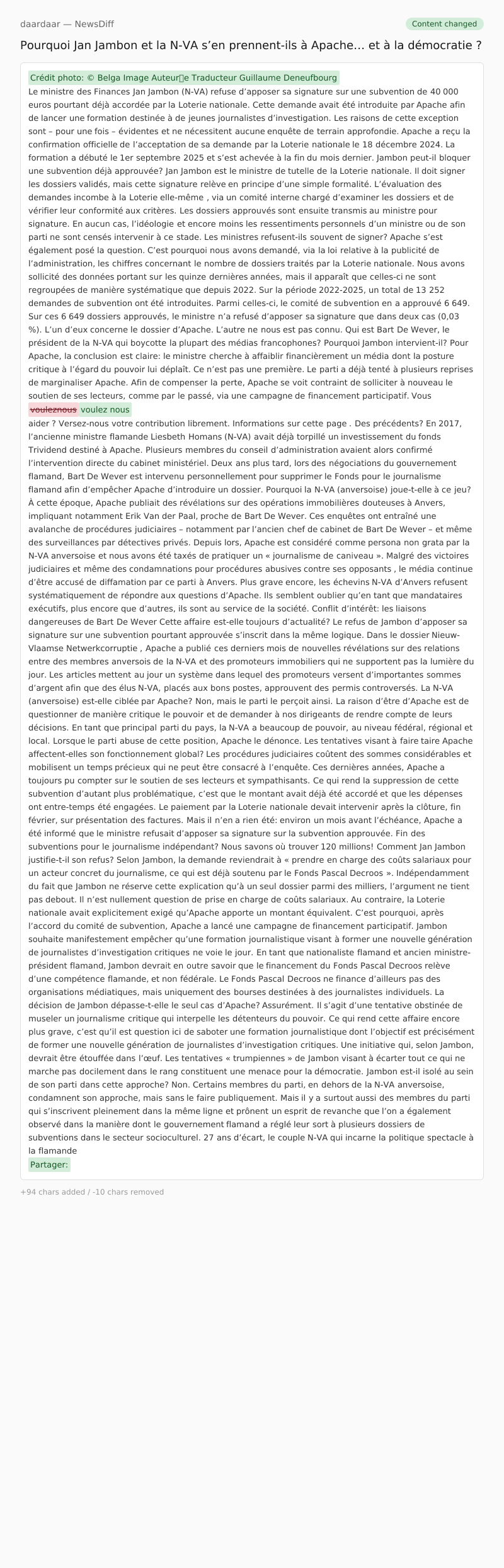 Deux ans plus tard, lors des négociations du gouvernement flamand, Bart De Wever est intervenu personnellement pour supprimer le Fonds pour le journalisme flamand afin d’empêcher Apache d’introduire un dossier.